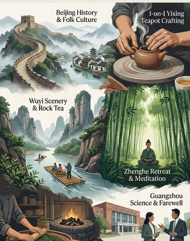 Academic & Cultural Context The schedule includes visits to selective museums, premium teaware galleries, and a professional tea teaching studio. We also include cultural anchors, such as a guided study of the Great Wall and the Big Red Robe immersive performance. The academic perspective is highlighted by a private, informal meeting with the Dean of the Tea Program at South China Agricultural University, providing personal insight into modern tea science.