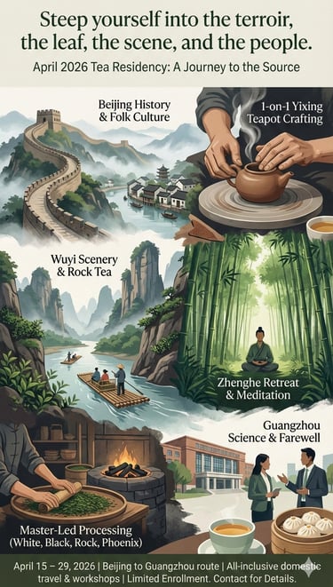 Technical Immersion This residency is centered on the private workshops of recognized Intangible Cultural Heritage Inheritors. Participants will observe and practice processing techniques for Rock Tea, White Tea, Phoenix oolong, and Black Tea, guided directly by lineage holders. In Yixing, you will work one-on-one with a master instructor to design and build a Purple Clay (Zisha) teapot. The piece will be professionally fired and shipped to your home in Canada after the trip.